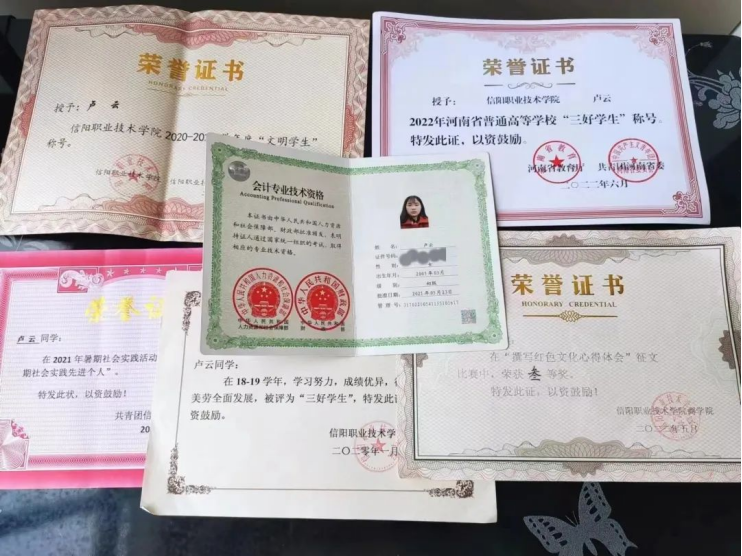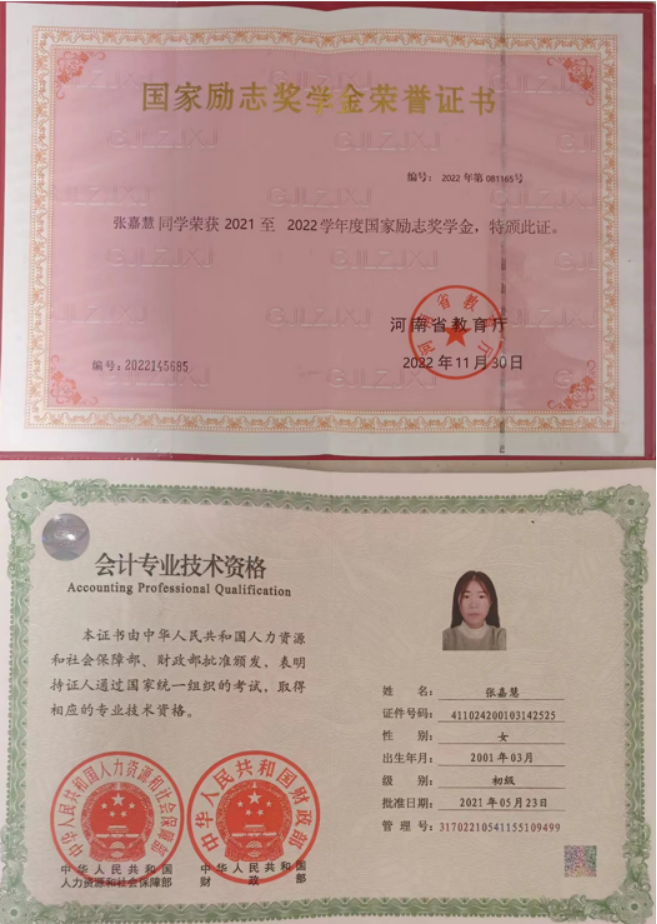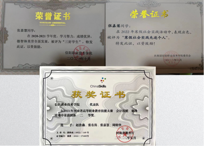 获奖情况:专业成绩排名多年蝉联班级前三,在校期间曾荣获" 初级会计资格证书""河南省三好学生""暑假社会实践先进个人"等荣誉证书