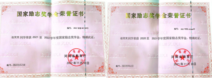 获奖情况:国家励志奖学金、河南省“三好学生”、二等奖学金等