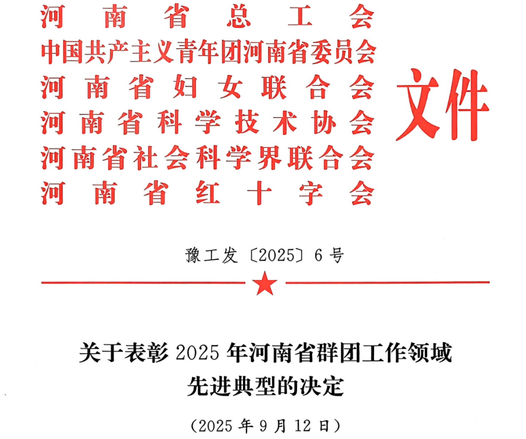 群团组织是党联系人民群众的桥梁和纽带,群团事业是党的事业的重要组成部分。为表彰先进、树立典型,省总工会、团省委、省妇联、省科协、省社科联、省红十字会下发关于表彰2025年河南省群团工作领域先进典型的决定,太阳成tyc7111cc集团团总支凭借其卓越的工作成效和昂扬的集体风貌,被授予“河南省青年五四奖”荣誉称号。