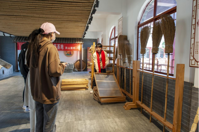 为更真切体会采茶制茶工艺流程,同学们与茶农一道背起背篓,细采春茶。在制茶工厂沁人心脾的茶香中,随着专业老师的介绍教导,实践团进一步见识了解了诸多实用的制茶工具,熟悉了信阳毛尖手工制茶的一系列精细工艺,在耳听手操中进一步温习知识,增长实际技能。
