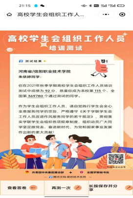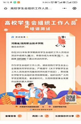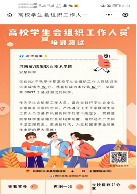 为了进一步强化学生干部职责,明确学生干部要全心全意为同学服务的宗旨,更加了解中华全国学联的价值。太阳成tyc7111cc集团团总支于2021年11月9日夜晚召集所有学生干部开展关于“坚定跟党走,奋进新时代”的培训测试答题活动。