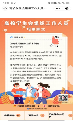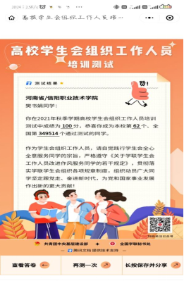 这次培训测试活动不仅使同学们更加深刻地了解到自己的工作内容,作为一名学生干部需要全心全意为同学服务,更要有为党和国家事业出一份力的责任心,这为我们在校园中更好的成长指明了方向。