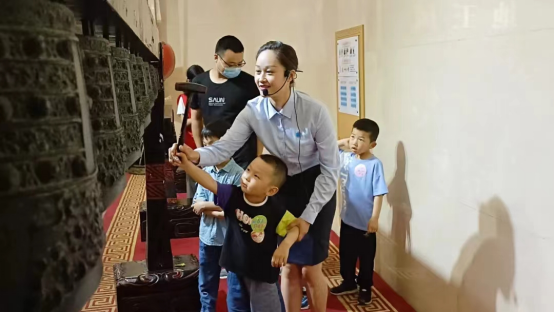 在“楚地王风”展厅,孩子们认真聆听了博物馆工作人员用信阳出土的战国编钟演奏的传统曲目《东方红》和《八月桂花遍地开》,开心的跟着讲解员现场学习编钟演奏技巧。