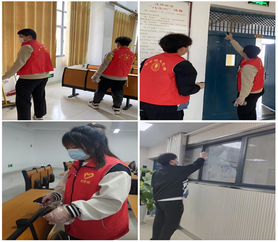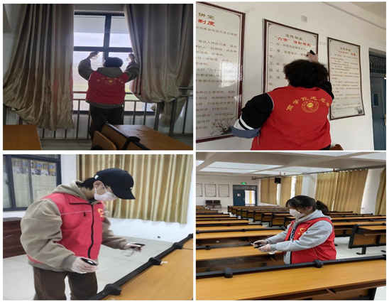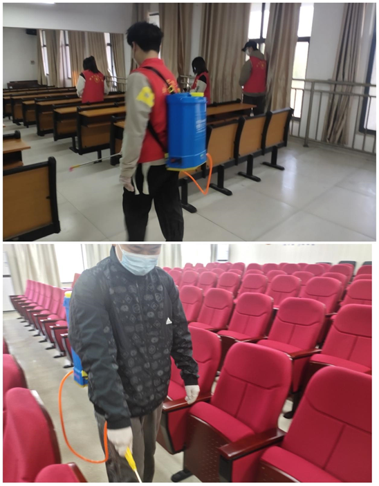 消杀作业现场,志愿者们身穿红马甲、佩戴口罩、手套等,携带消杀设备,对学院各教室及报告厅进行细致全面地消毒,教室地面、课桌椅、讲台、门把手、窗户,手能触碰到的位置逐一进行喷洒消毒,做到不留死角,用实际行动彰显了志愿者无私奉献的精神,展现了志愿者的责任与担当,让学院全体师生能在安全、卫生、健康的环境中学习。进行“地毯式”消杀作业。